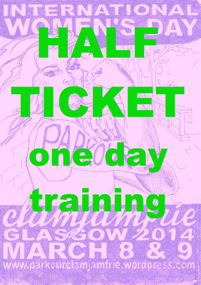 A HALF TICKET gets you one day of parkour training, suitable for all ages and abilities, with international female coaches! AND seminars on relevant skills like circus arts and stretching! Choose either Saturday or Sunday.